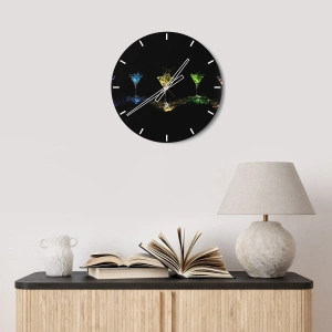 - Bebidas coloridas em copos são apresentadas sobre um fundo preto, criando um motivo decorativo elegante e moderno. Este relógio de parede é perfeito para bares, cozinhas ou salas de estar.