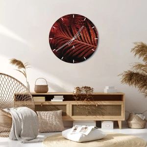 - Um relógio redondo de vidro de 30x30 cm com uma representação artística de folhas vermelho-alaranjadas de uma planta tropical sobre um fundo escuro, perfeito para interiores com um caráter exótico.