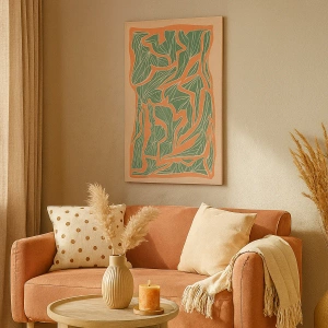 - O padrão botânico em tons de verde e laranja é uma decoração elegante que adiciona um toque natural e harmonioso a qualquer ambiente. Perfeito para sala de estar ou quarto.