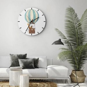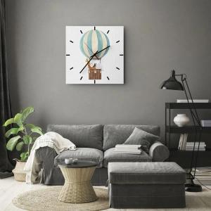 Relógio de parede - Relógio em vidro - Um balão com uma girafa e um elefante flutuando nas nuvens - 30x30cm - Viagem fantástica - Decoração de parede moderna para a sala de estar, cozinha e quarto ARTTOR