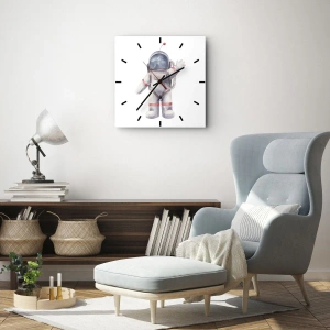 - O relógio apresenta uma encantadora ilustração de um astronauta com o braço levantado, em pé, sobre um fundo branco. A composição minimalista e o estilo infantil do desenho adicionam um toque leve e positivo a qualquer interior.