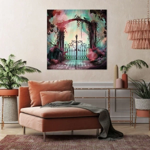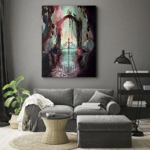 - Esta tela de 70x50 cm retrata uma entrada mágica com um portão de ferro forjado cercado por uma vegetação exuberante e colorida. Uma decoração única que cria uma atmosfera misteriosa e fantástica.