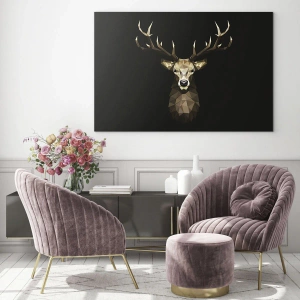 A pintura é feita em vidro medindo 70x50 cm, o que lhe confere um caráter moderno e elegância. A imagem estilizada de um cervo em forma geométrica se encaixa na estética de interiores contemporâneos, harmonizando-se perfeitamente com os estilos escandinavo, industrial ou loft. A decoração pode ser o ponto focal do arranjo em uma sala de estar, escritório ou quarto, trazendo um toque moderno e expressivo ao espaço.