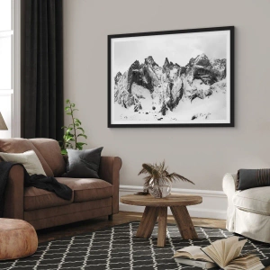 Pôster com moldura preta - Uma paisagem montanhosa acidentada em preto e branco - 50x70cm - O assustador cume de granito - Decoração de parede moderna para a sala de estar e quarto ARTTOR