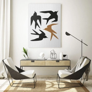 - Uma composição delicada e elegante com quatro andorinhas voando em um design minimalista. A combinação de preto, branco e marrom adiciona um toque sutil. Uma decoração de parede perfeita para os amantes da natureza e da simplicidade.