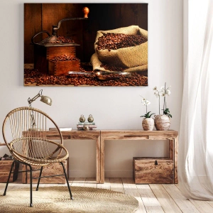 Quadro em tela - Um antigo moedor de café com grãos e um saco em estilo rústico. - 70x50cm - Natureza morta com grãos de café e moedor - Decoração de parede moderna para a sala de estar e quarto ARTTOR