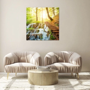 - A pintura retrata uma cachoeira na floresta com um caminho de madeira iluminado pela luz do sol. A composição natural e a harmonia das cores trazem paz e inspiração ao interior.