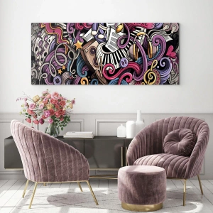 Descubra uma impressão de arte em vidro exclusiva que traz inspiração musical colorida para o seu interior. Ela apresenta padrões abstratos, notas musicais e motivos de instrumentos musicais, como um microfone e um alto-falante. É a escolha perfeita para quem aprecia arte moderna e cores vibrantes.