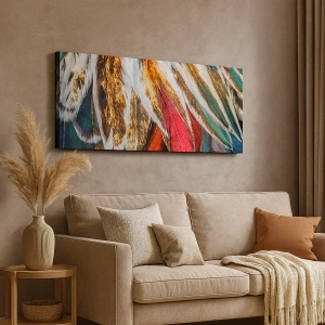 A tela é esticada na moldura. Os lados e bordas são impressos para criar uma continuação da imagem. O quadro está pronto para ser pendurado na parede. Cada produto tem um gancho ligado à moldura e um conjunto de montagem (parafuso + cavilha).