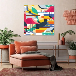 Quadro em tela - Pássaros coloridos em uma composição abstrata e geométrica - 70x50cm - A festa dos pássaros - Decoração de parede moderna para a sala de estar e quarto ARTTOR