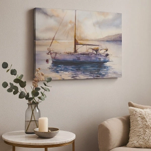- Esta pintura atmosférica retrata um iate em um mar calmo ao pôr do sol. A paisagem encantadora é acentuada por reflexos sutis da água e cores quentes, tornando-a uma decoração ideal para sala de estar, quarto ou escritório.