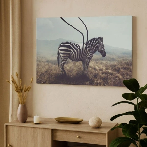 A tela é esticada na moldura. Os lados e bordas são impressos para criar uma continuação da imagem. O quadro está pronto para ser pendurado na parede. Cada produto tem um gancho ligado à moldura e um conjunto de montagem (parafuso + cavilha).