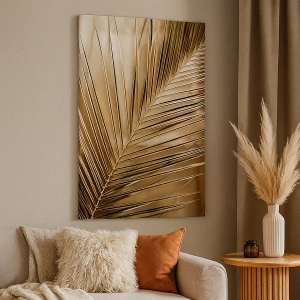 - Uma folha de palmeira dourada sobre um fundo sólido. Uma composição minimalista e elegante, perfeita para interiores modernos e tropicais, adicionando sutileza e luxo.