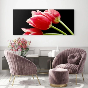 Quadro em vidro - Tulipas vermelhas com gotas de orvalho em um fundo preto - 70x50cm - A promessa do amor puro - Decoração de parede moderna para a sala de estar e quarto ARTTOR