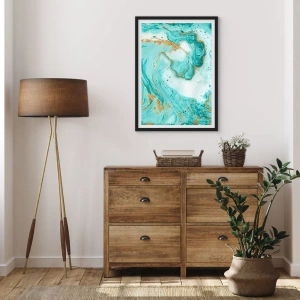 • Este pôster apresenta um abstrato turquesa e dourado em estilo mármore. Perfeito para interiores modernos, ele adiciona elegância e um toque artístico.