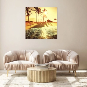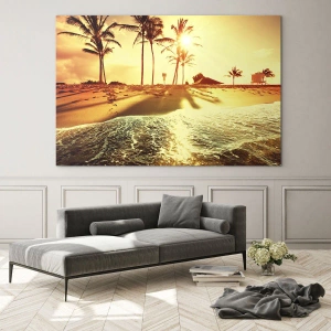 Quadro em vidro - Praia dourada com palmeiras ao pôr do sol e mar calmo - 70x50cm - Califórnia à tarde - Decoração de parede moderna para a sala de estar e quarto ARTTOR