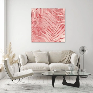 - A pintura retrata folhas tropicais rosa em uma composição elegante e harmoniosa. Seu estilo e cores modernos tornam a decoração atraente e adicionam uma atmosfera exótica ao interior.