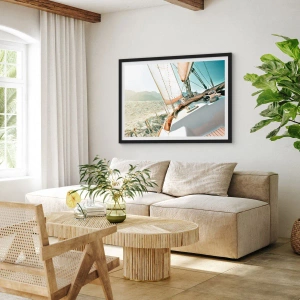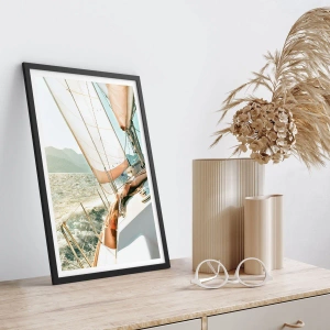 - O pôster retrata um iate a todo vapor em mar aberto, iluminado pelos raios de sol. Perfeito como decoração de interiores, ele adiciona elegância e tranquilidade. A moldura preta destaca o caráter único da imagem.