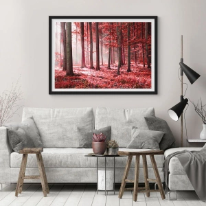 Pôster com moldura preta - Uma floresta com folhas vermelhas e neblina pela manhã - 50x70cm - O vermelho também é belo - Decoração de parede moderna para a sala de estar e quarto ARTTOR