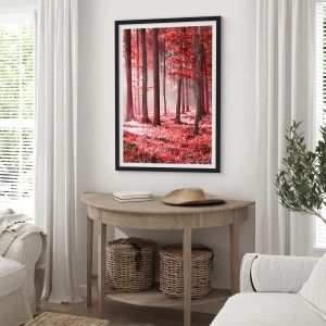 - Este pôster retrata uma floresta matinal com folhas vermelhas e neblina. Esta fotografia, com seus detalhes sutis, é perfeita para interiores elegantes e minimalistas.