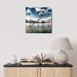 Ilha de Vidro é uma decoração de parede única que traz a atmosfera de uma cidade moderna para o seu interior. A vista da ponte e do panorama da cidade, cercada por água, cria uma paisagem dinâmica e harmoniosa que atrai a atenção e inspira. Esta imagem combina a beleza da arquitetura e da natureza em um só lugar.