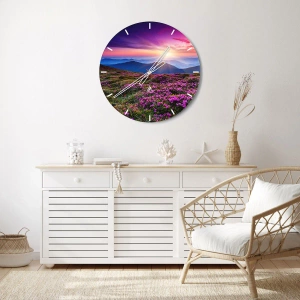 O relógio de parede "Ramos de ervas frescas com aroma da colheita" é um belo elemento decorativo que traz harmonia e uma atmosfera relaxante ao interior. A pintura retrata uma pitoresca cadeia de montanhas que se estende até o horizonte. Flores rosas desabrochando em primeiro plano, contrastando com os prados verdejantes, contribuem para o charme. O pôr do sol, com seus delicados raios de luz, ilumina a paisagem, criando um cenário mágico repleto de cores quentes e inspiradoras.