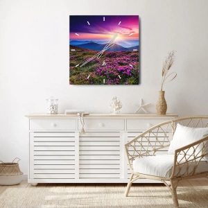 Relógio de parede - Relógio em vidro - Paisagem montanhosa com flores rosas desabrochando - 30x30cm - Campo cheiroso - Decoração de parede moderna para a sala de estar, cozinha e quarto ARTTOR