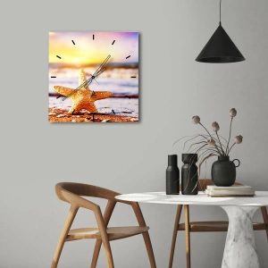 Relógio de parede - Relógio em vidro - Estrela do mar na praia ao pôr do sol - 30x30cm - Presente do mar - Decoração de parede moderna para a sala de estar, cozinha e quarto ARTTOR