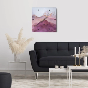 Relógio de parede "Ondas lilás e roxas" retrata delicadas ondas abstratas em tons de lilás e roxo, decoradas com sutis detalhes dourados. A composição é inspirada no movimento das aquarelas sobre um fundo claro.