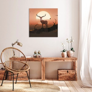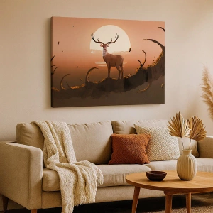 - Uma pintura mágica representando um cervo tendo como pano de fundo o pôr do sol e uma paisagem surreal, perfeita para interiores cheios de sofisticação.