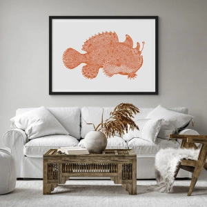 - O pôster apresenta uma ilustração detalhada de um peixe de águas profundas em tom ferrugem, com linhas precisas sobre um fundo claro. O estilo minimalista e a atenção aos detalhes conferem-lhe um toque elegante e moderno.