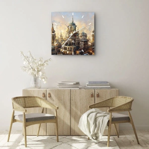 A arquitetura é uma combinação de estilos - detalhes góticos, cúpulas barrocas e influências orientais. Formas maciças se entrelaçam com estruturas leves, criando um efeito de profundidade e escala. A ilustração evoca cidades conhecidas de histórias de fantasia ou antigos livros de viagens.