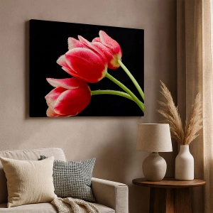 Arte de parede - Promessa de Amor Puro - Tulipas vermelhas com gotas de orvalho sobre fundo preto