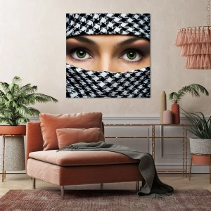 Quadro em tela - Os olhos verdes de uma mulher estão escondidos atrás de um tecido estampado em preto e branco. - 70x50cm - Retrato de uma beleza velada de olhos verdes - Decoração de parede moderna para a sala de estar e quarto ARTTOR