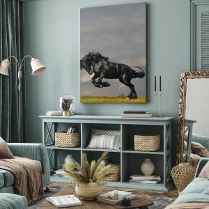 A pintura foi impressa em tela premium, o que garante durabilidade e intensidade de cor. Seu formato horizontal, medindo 70x50 cm, é ideal para sala de estar, escritório ou quarto. O contraste entre o cavalo preto e o fundo claro confere à composição profundidade e estética excepcionais.