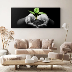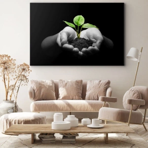 Quadro em tela - Mãos segurando uma planta verde em um fundo preto - 70x50cm - Eu amo a natureza, eu a protejo - Decoração de parede moderna para a sala de estar e quarto ARTTOR