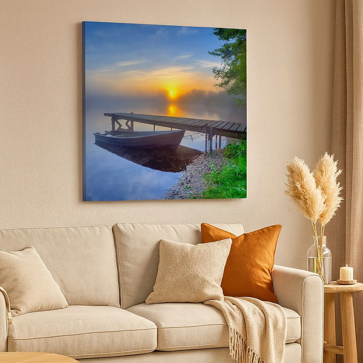 A tela é esticada na moldura. Os lados e bordas são impressos para criar uma continuação da imagem. O quadro está pronto para ser pendurado na parede. Cada produto tem um gancho ligado à moldura e um conjunto de montagem (parafuso + cavilha).