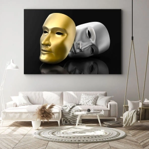 • A pintura retrata uma máscara de ouro e prata sobre um fundo preto profundo. As cores contrastantes e as superfícies brilhantes das máscaras enfatizam seu simbolismo e elegância, tornando-as ideais como decoração de interiores expressiva.