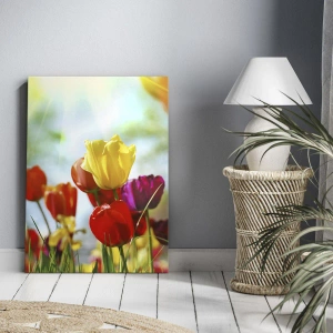 A impressão em tela intitulada "Todas as cores do sol" retrata lindas tulipas coloridas banhadas pelos raios solares. É uma cena perfeita da natureza primaveril, repleta de frescor e uma harmonia de cores que cria um clima de paz e alegria.
