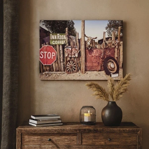 Quadro em tela - Decorações rústicas com placas e uma roda na cerca - 70x50cm - E o tempo parou - Decoração de parede moderna para a sala de estar e quarto ARTTOR