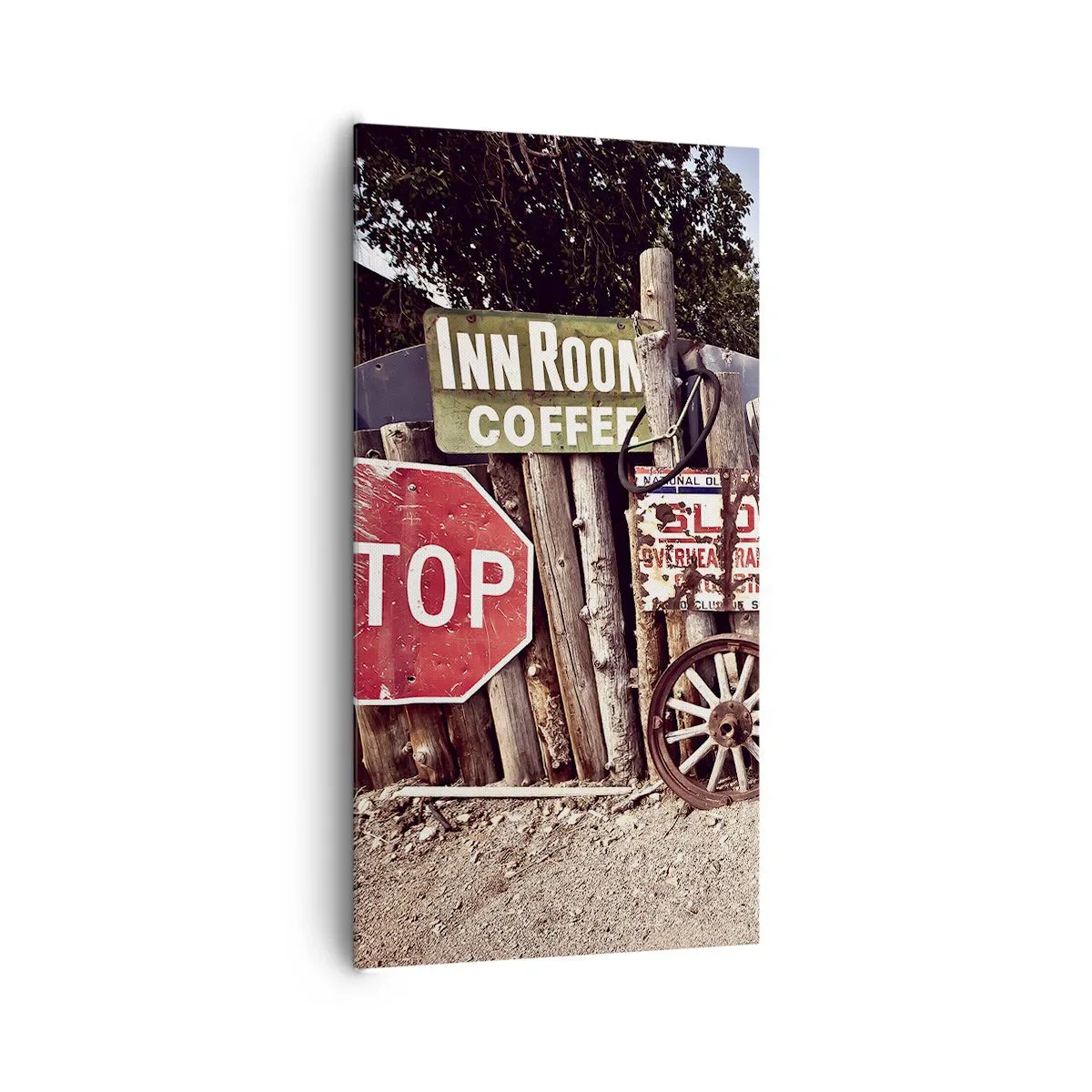 A tela é esticada na moldura. Os lados e bordas são impressos para criar uma continuação da imagem. O quadro está pronto para ser pendurado na parede. Cada produto tem um gancho ligado à moldura e um conjunto de montagem (parafuso + cavilha).
