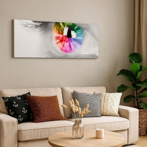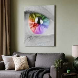 Quadro em tela - Foto artística de um olho com uma íris de arco-íris em um fundo cinza - 70x50cm - Olhar para o mundo a cores - Decoração de parede moderna para a sala de estar e quarto ARTTOR