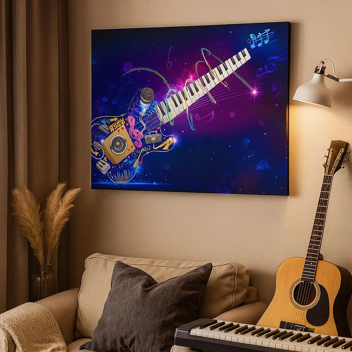 - Uma composição musical colorida com violão, teclado e microfone, tendo como pano de fundo um céu roxo vibrante. Um toque dinâmico e moderno para qualquer ambiente.