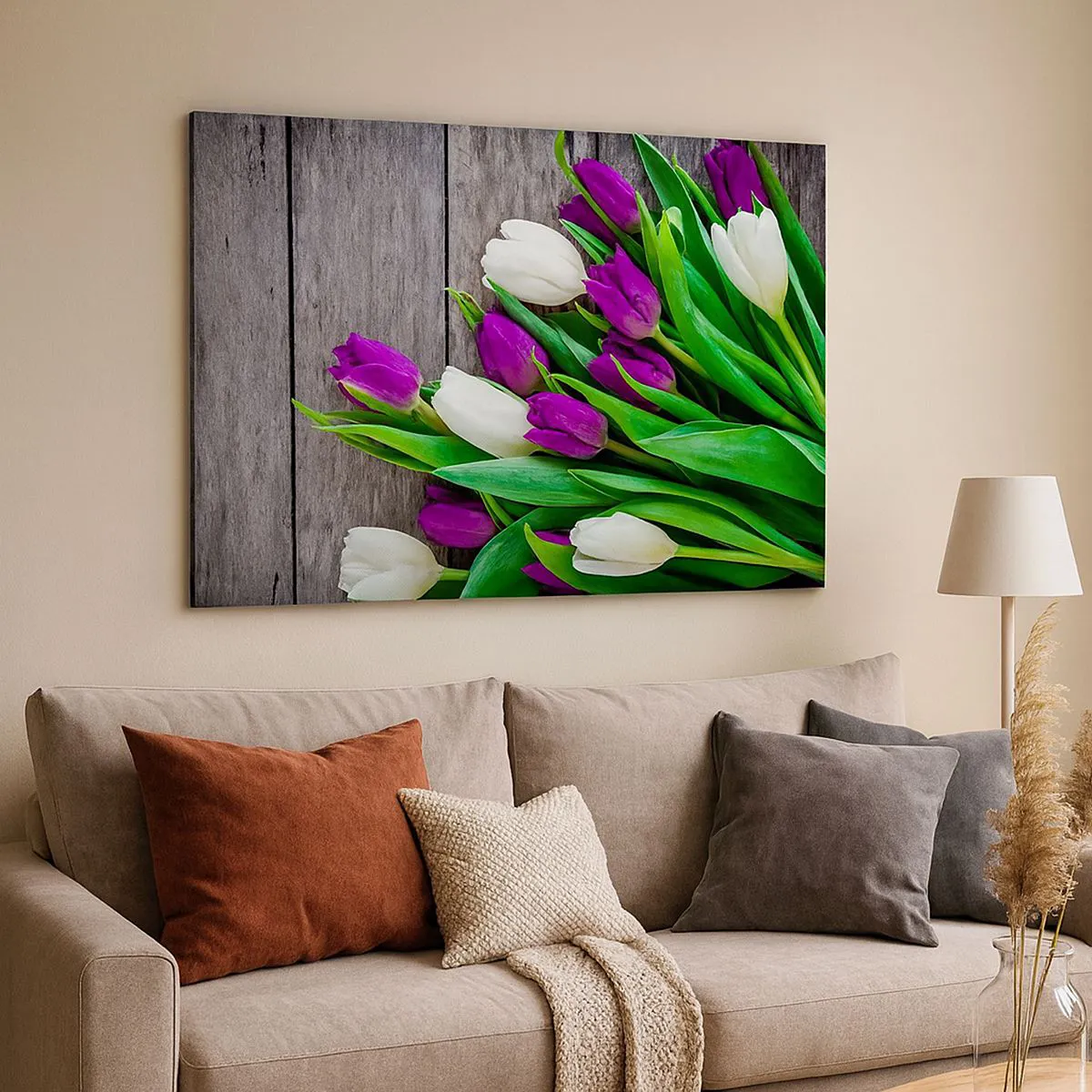Quadro em tela - Um buquê de tulipas roxas e brancas em um fundo de madeira - 70x50cm - No dia do feriado da primavera - Decoração de parede moderna para a sala de estar e quarto ARTTOR