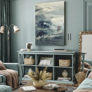 - Esta impressão em tela retrata uma paisagem misteriosa com um castelo erguido sobre rochas, montanhas ao fundo e um navio em um mar tempestuoso. Perfeito para os amantes de decoração excêntrica.