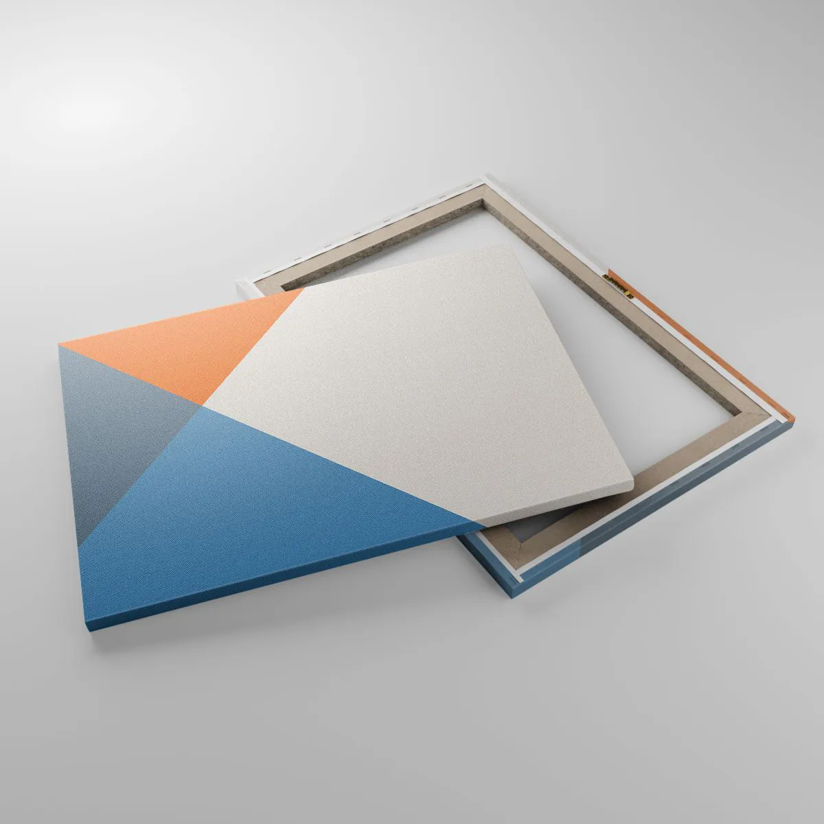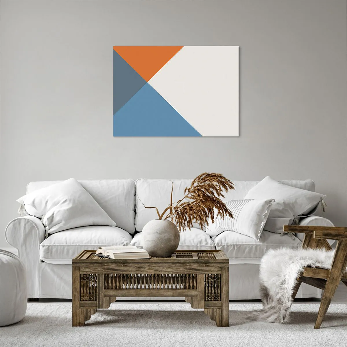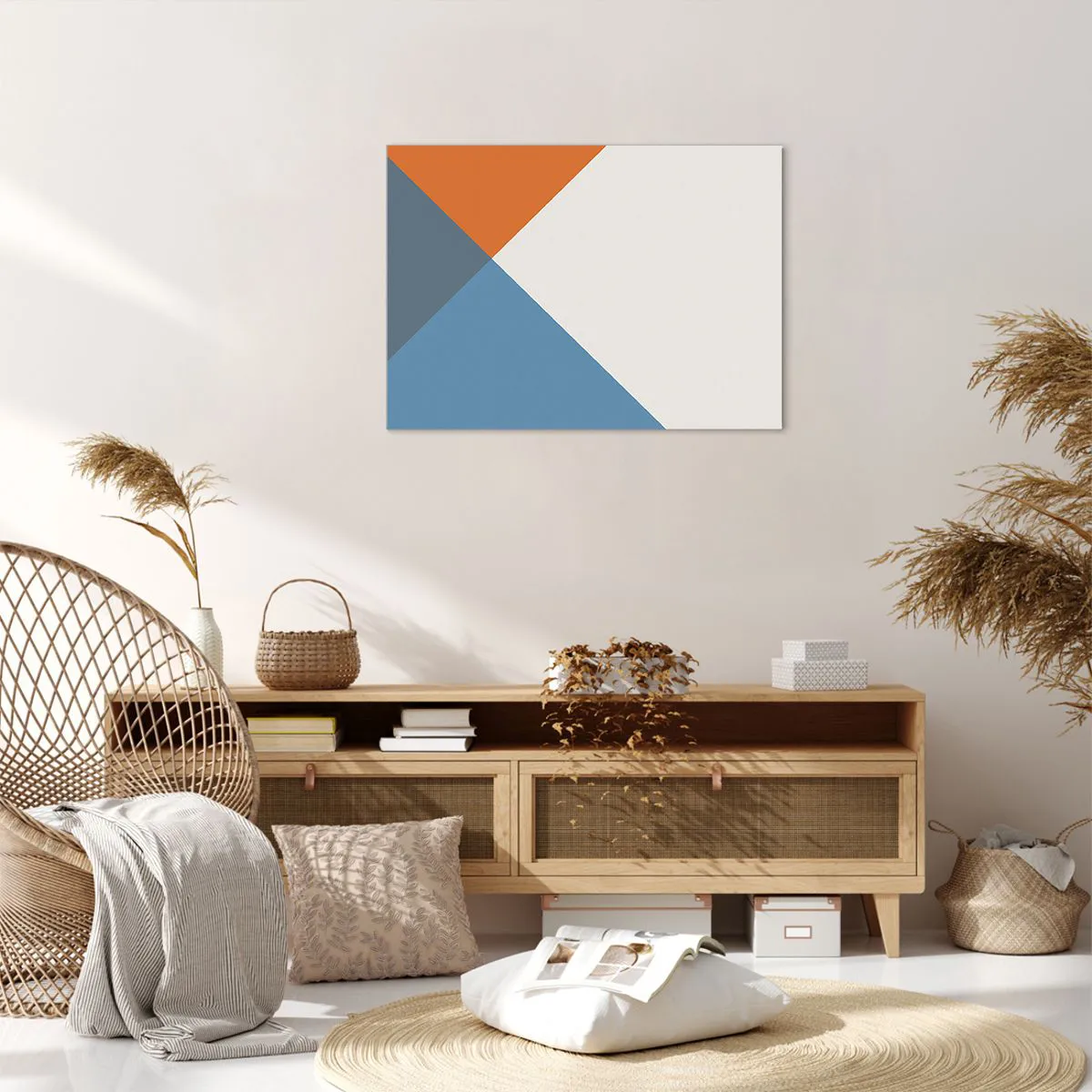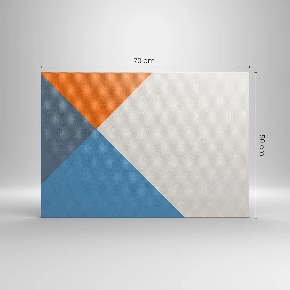 - Esta impressão em tela minimalista apresenta padrões geométricos triangulares em tons de azul, branco e laranja. Perfeita como decoração moderna para sala de estar, quarto ou escritório.