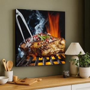- Uma pintura representando um bife suculento grelhado na grelha com especiarias aromáticas e uma fogueira ao fundo. Perfeito para amantes da gastronomia e para criar uma atmosfera acolhedora na cozinha ou na sala de jantar.