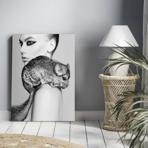 Arte de Parede - Senhora com Chinchila - Mulher estilizada com uma chinchila em uma elegante composição em preto e branco