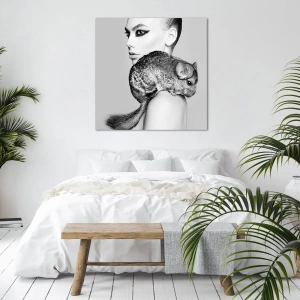 Quadro em tela - Mulher estilizada com uma chinchila em uma elegante composição em preto e branco - 70x50cm - A dama com a chinchila - Decoração de parede moderna para a sala de estar e quarto ARTTOR