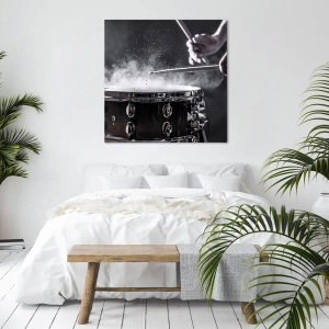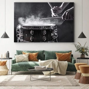 - Uma impressão em tela de 70x50 cm representando um som dinâmico de batida de baqueta com poeira subindo do tambor, perfeita para amantes de música e interiores modernos.